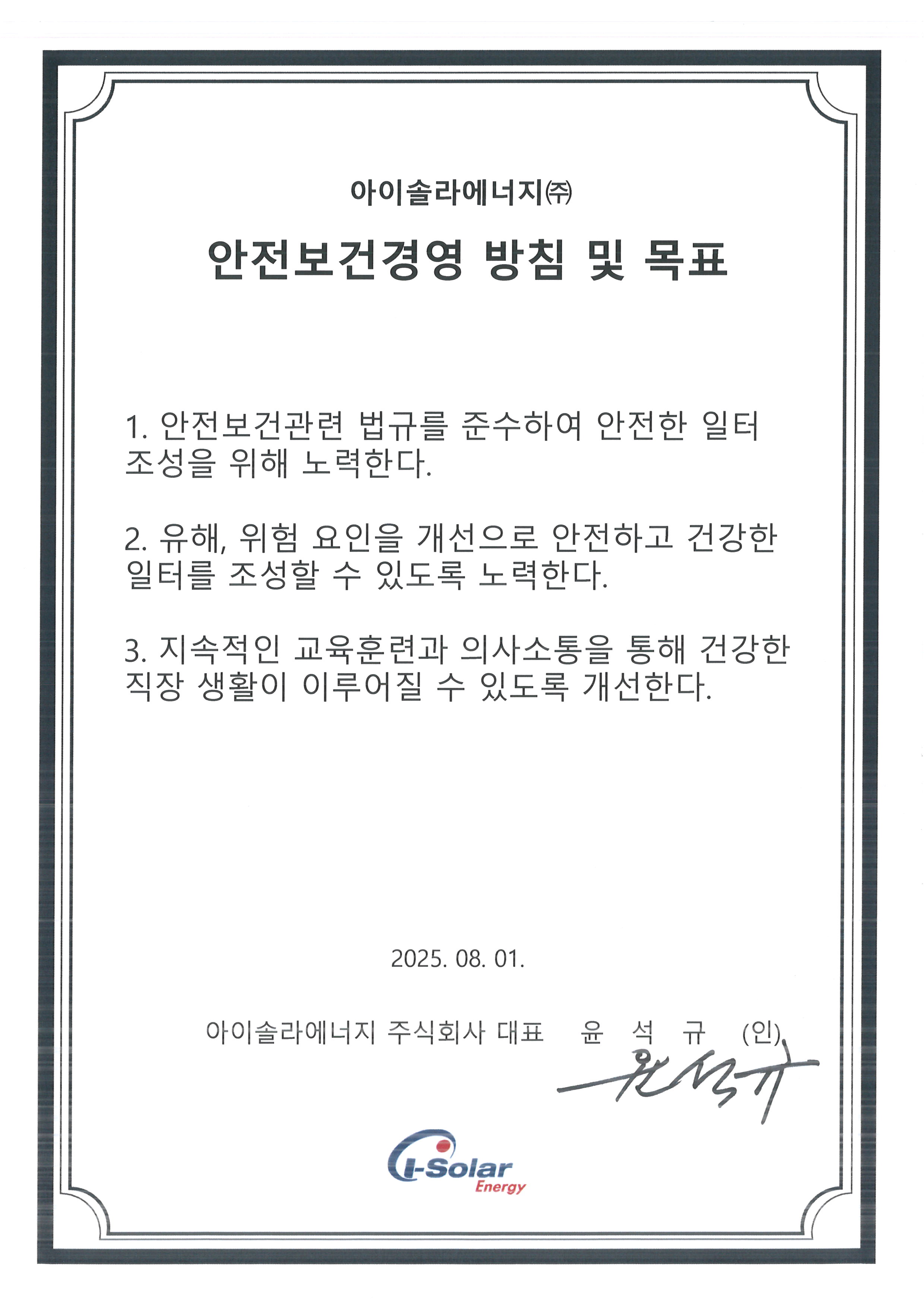 [아이솔라에너지(주)] 안전보건경영방침 및 목표